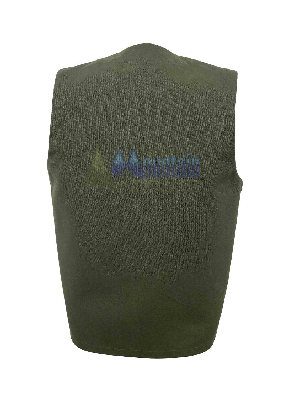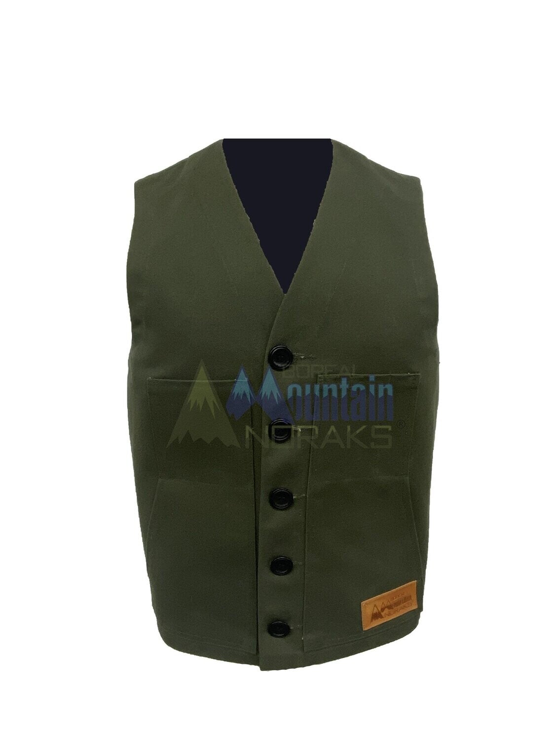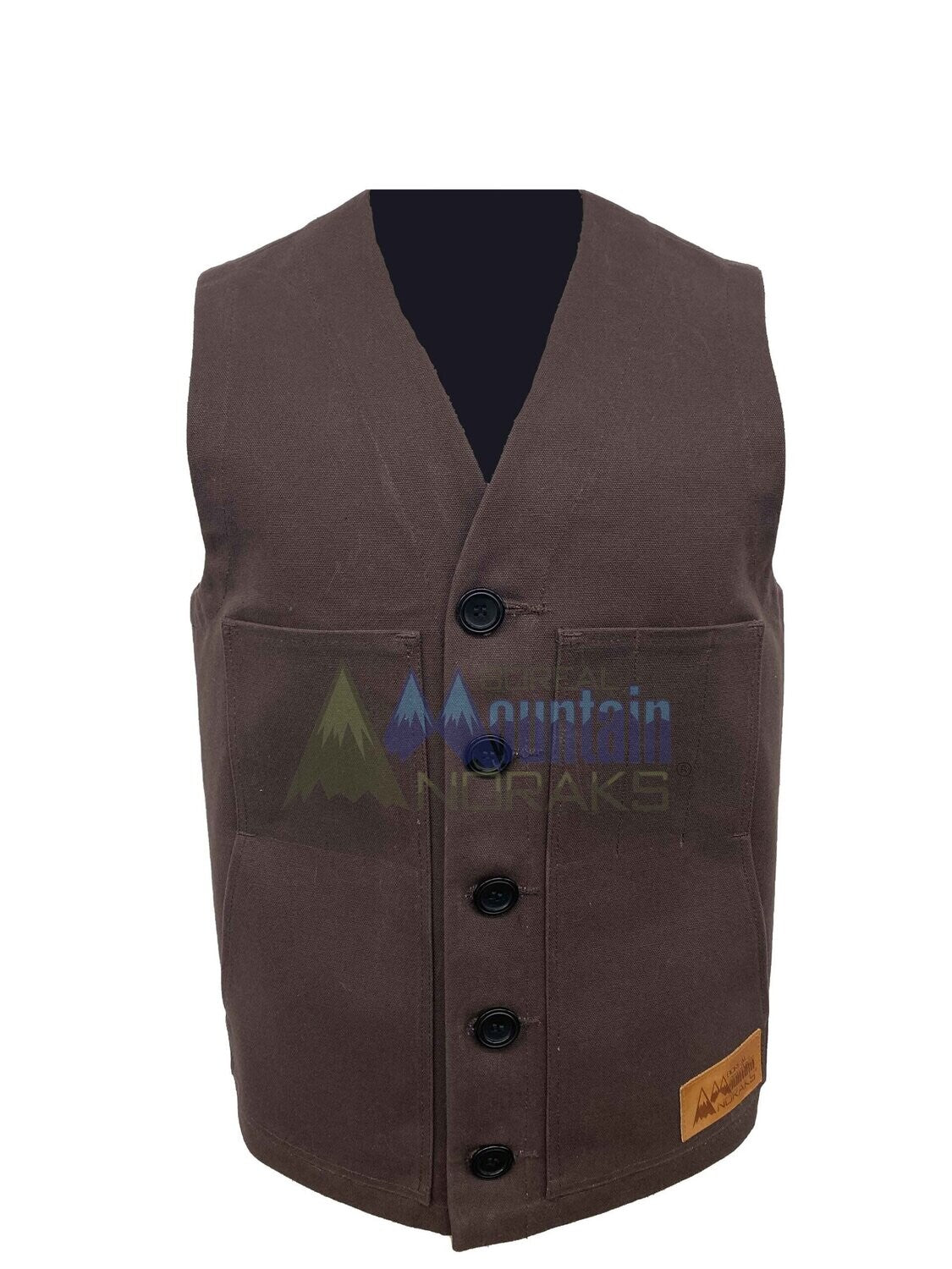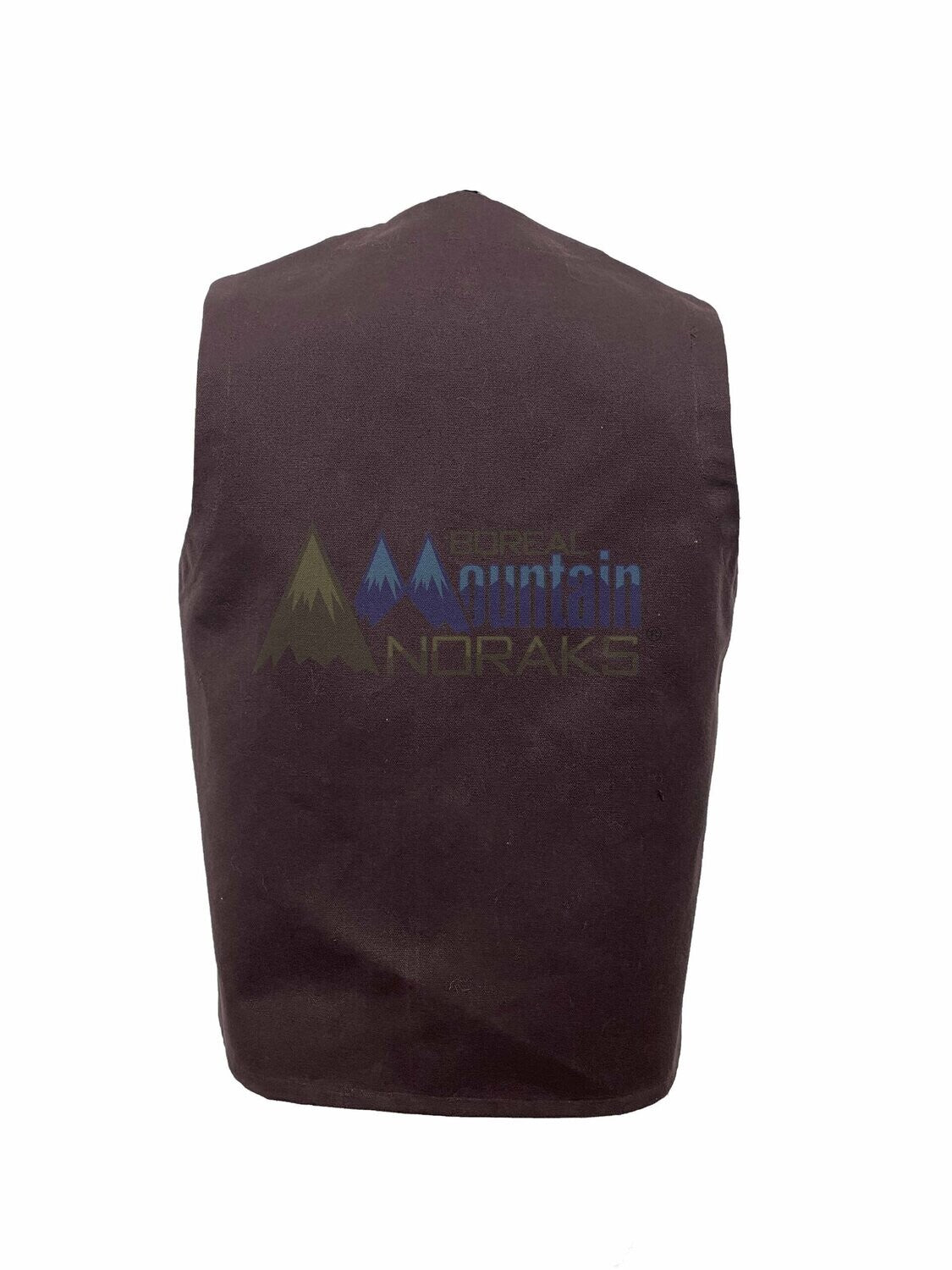 This is the BMA Canvest©, made of 10.10oz waxed cotton canvas. The two front pocket panels feature 2 lower slots ideal for resting your hands, as well as a 3-slotted utility pocket on the upper left side and a full one on the upper right. It is water repellent, antimicrobial and free of any hardware that can fail. Available in 2 colors.